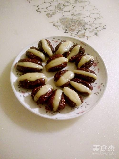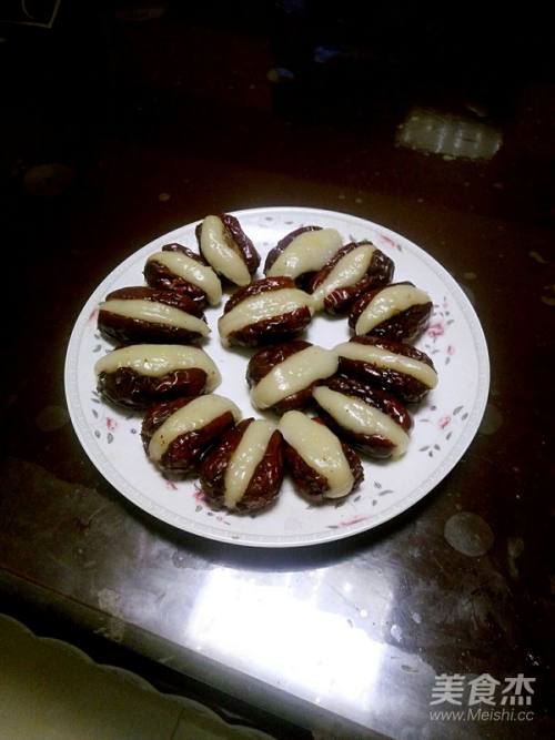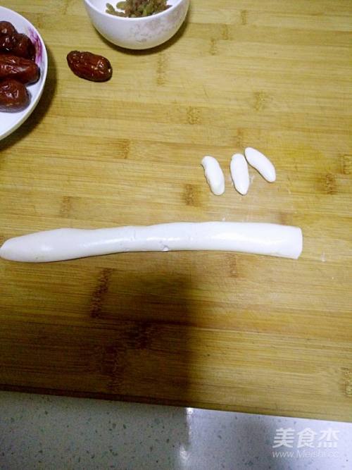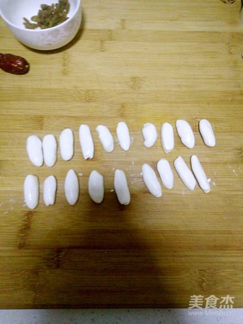 7将葡萄干和小面条加入红枣中间。