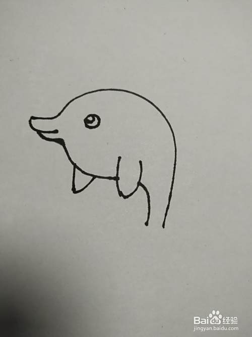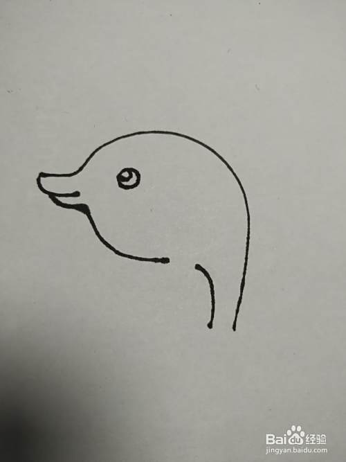 在海豚头部中间位置画出海豚圆圆的眼睛。在眼睛上点出眼珠。