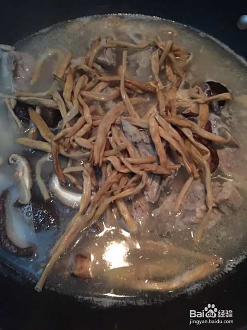 然后依次放入海带香菇,和黄花菜。