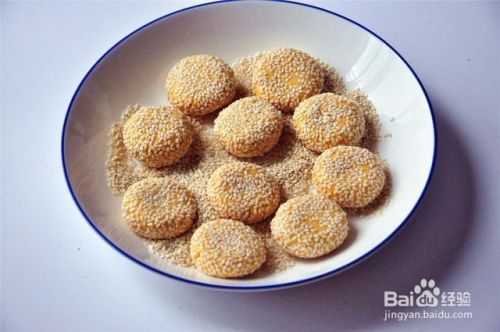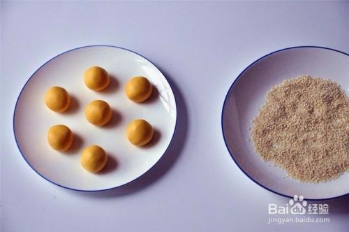 将面团分成15-20克一个的小球将小球在白芝麻中滚一圈,轻轻粘上芝麻。