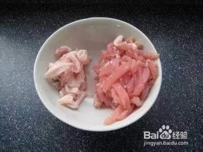 再将猪里脊肉肥瘦用刀切开,分开。不要肥肉,留下瘦肉,慢慢切成小碎肉片。