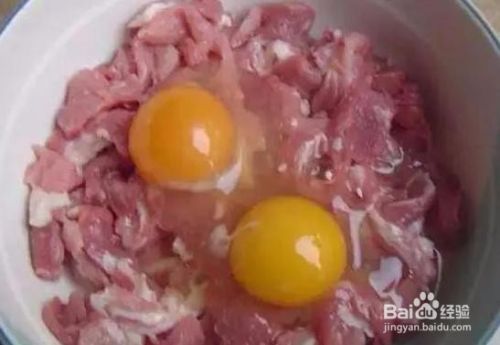 将切好的瘦肉倒入打好的鸡蛋中。