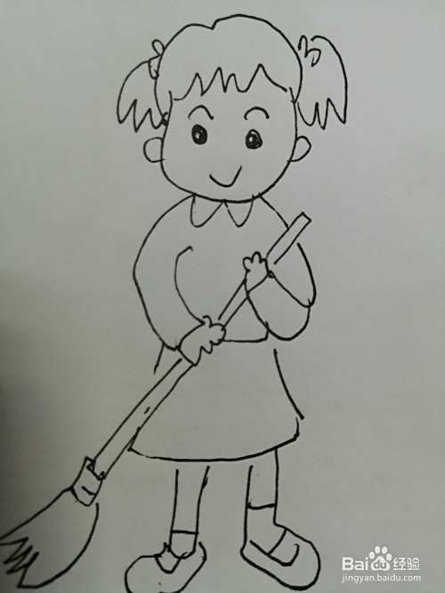 第六步,接着把扫地的小女孩的小裙子画出来,注意小裙子细节的画法。