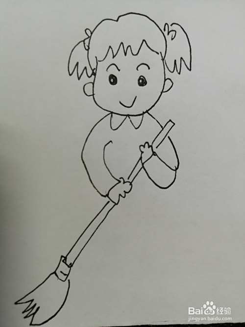 第五步,然后在小女孩的小手上画出一个简单的扫帚,注意扫帚细节的画法。