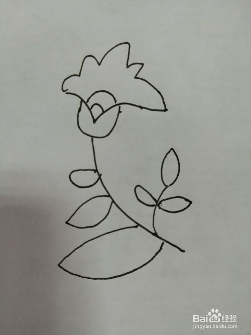 第六步,在花儿的枝干左边画出两片一大一小的叶子。