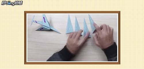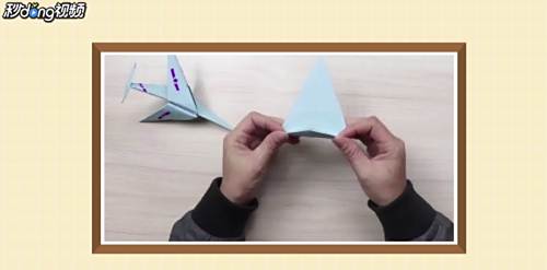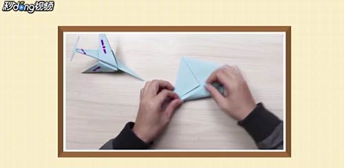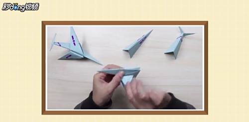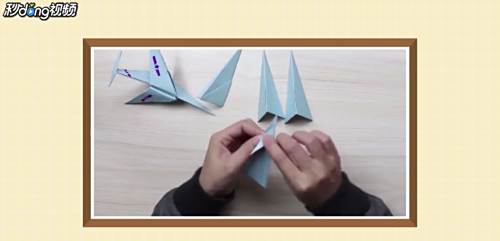 7把一个角塞入折痕的缝中,另一个角沿折痕往里对折后沿边往里塞入。另一边机翼同样操作。