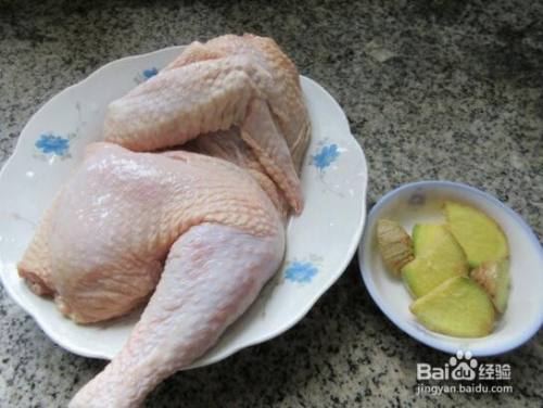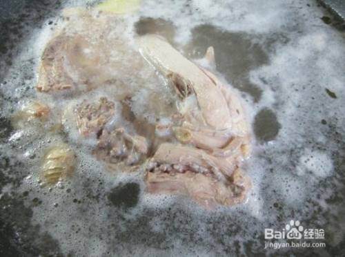 将三黄鸡下入清水锅中,搁入姜片、加适量的料酒,煮开、煮上15分钟左右。