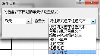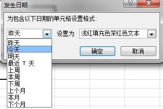 点击,选中要变化的列或行,excel文件“开始”-“条件格式”-“突出显示单元格规则”-“发生日期”