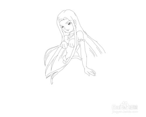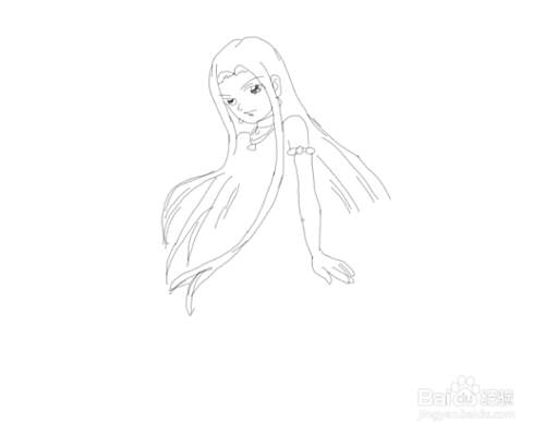 最后在身体的下面画出美人鱼的尾巴,然后在尾巴下面再画出美人鱼的头发,这样美人鱼就画好了,如图所示: