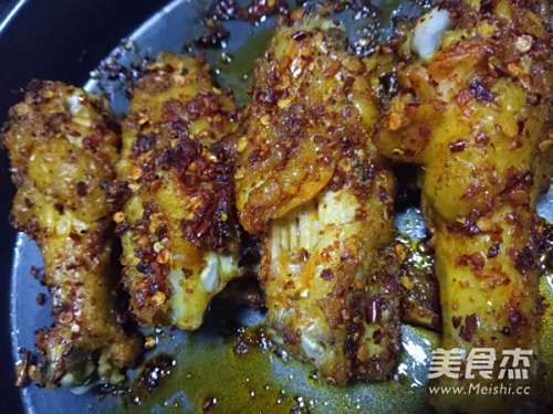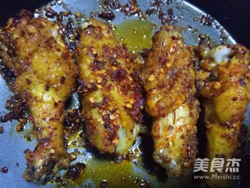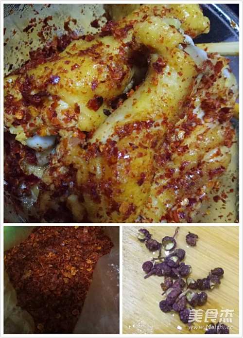 2在鸡翅,鸡腿中加入盐,辣椒面,花椒,搅拌均匀