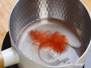 25g白糖、清水、白凉粉和红色食用色素倒入锅内,大火,煮沸。