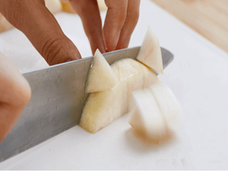 桃子清洗干净,去皮,切成小丁。