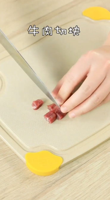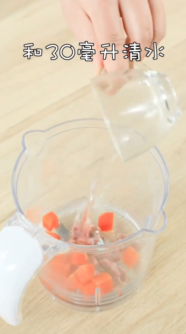 7辅食机中,倒入牛肉、胡萝卜、清水。