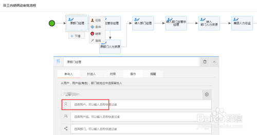 设计流程,用所需要的工具例如“任务”,“连线”来设置各个节点,同时需要在每个“任务”节点选择审批的用户或者通过“部门负责人”等其他选项来指定是谁审批。