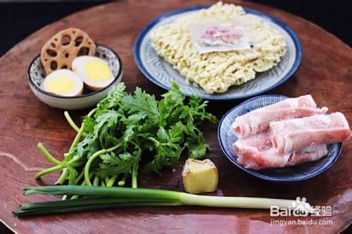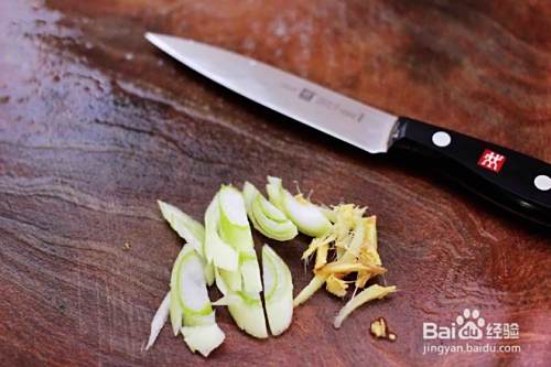 首先备齐所有的食材。用刀把葱姜切丝备用