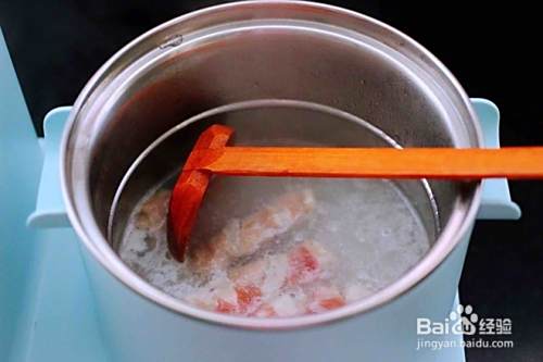 早餐机的汤锅里倒入适量的清水煮沸后,把羊肉卷焯一下水,变色即可捞出沥干水份备用。