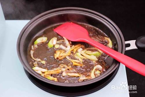 平底锅里放入方便面调料包的油料烧热后,放入葱姜爆出香味。