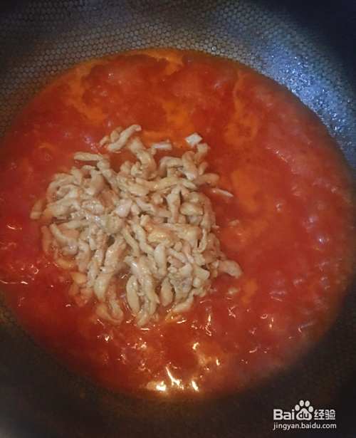 西红柿汁炒好后倒入炒好的肉丝煮一会就好入味,时间不宜过长。