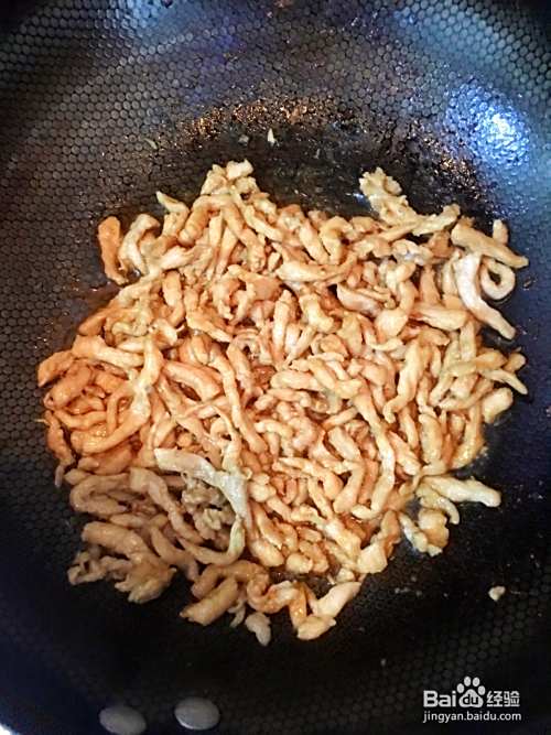 锅底放适量油,油热后倒入腌制好的肉丝,翻炒至肉发白就可以。觉得肉太白的可以在炒时放入一点点老抽。肉炒好放盘中备用。