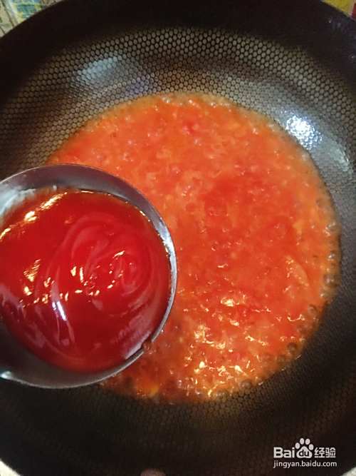 西红柿炒出汁后,倒入番茄酱继续翻炒(番茄酱根据自己口味添加)。