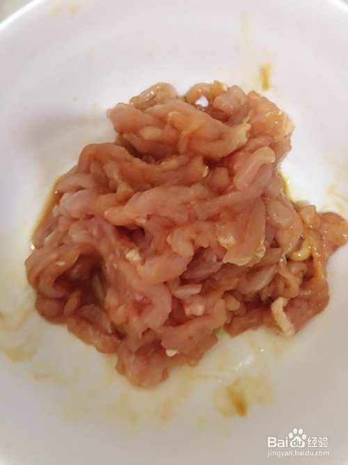 里脊肉切丝(不好切可事先在冰箱冷冻下),放入盐,酱油,白酒,用手抓均匀腌制十分钟。