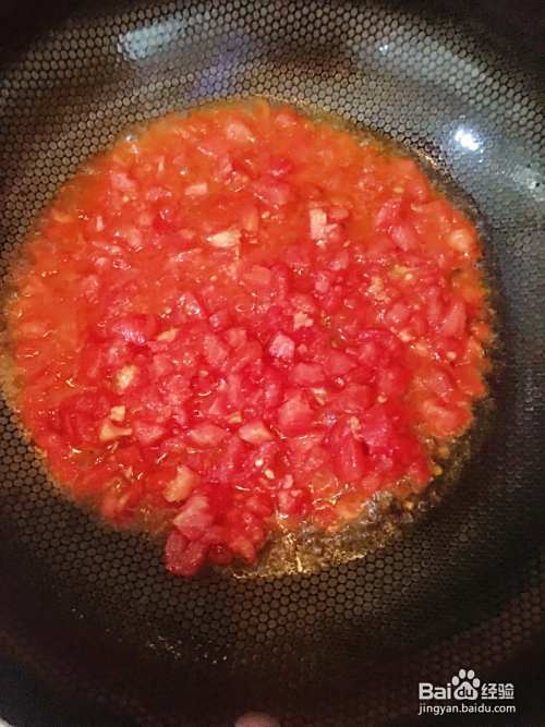 辣椒麻椒捞出后倒入西红柿丁进行翻炒,加入盐,鸡精,蚝油,倒入半碗开水,西红柿丁尽量多炒一会成汁状。