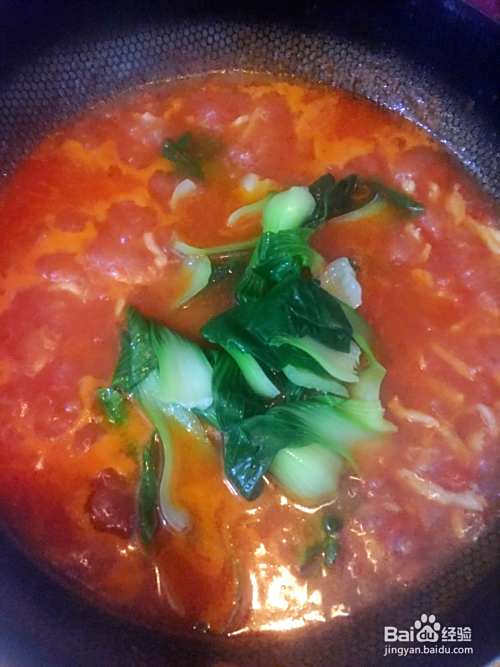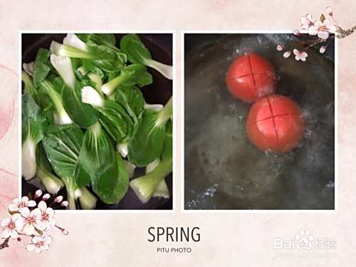 西红柿上部划十字,放入开水中煮一下下(30秒左右),时间不要长。西红柿煮好后,放入青菜焯水断生,捞出过凉水。
