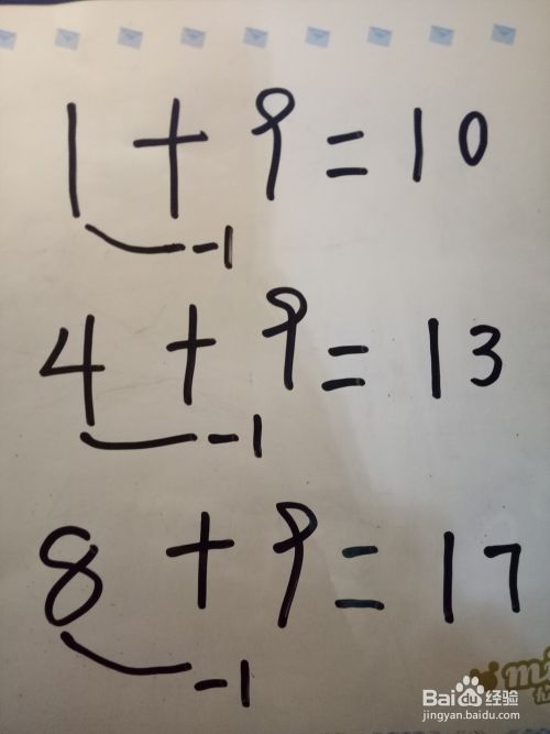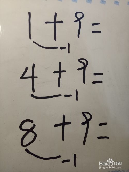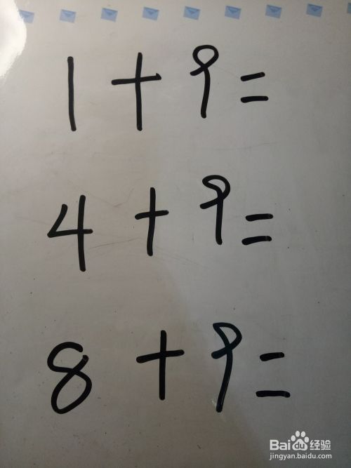 我们先写三个加法算式,都是加九的,不写答案。(1+9,4+9,8+9)不,