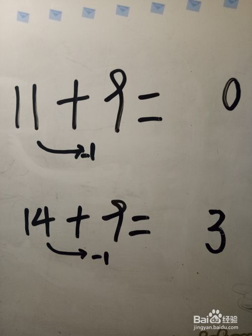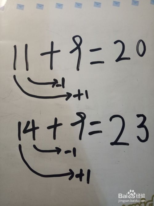 以此类推,我们来说下两位数加九的速算(11+9,14+9),同样个位数上的数减一,得到的答案写在等号后面。(1-1=0,4-1=3)