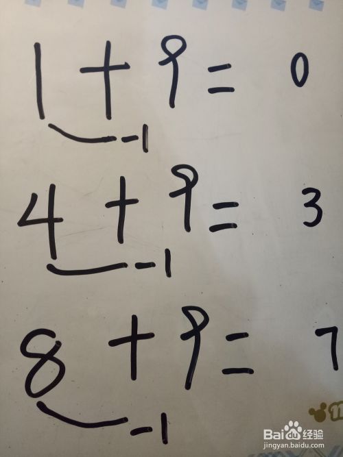 把所有加数减一的答案写在等号的后面,等号的左边留一点位置。(1-1=0,4-1=3,8-1=7)