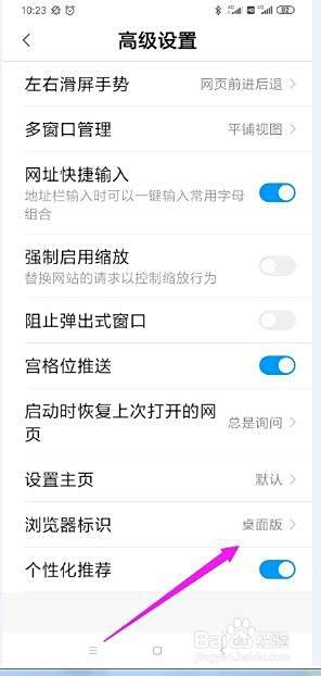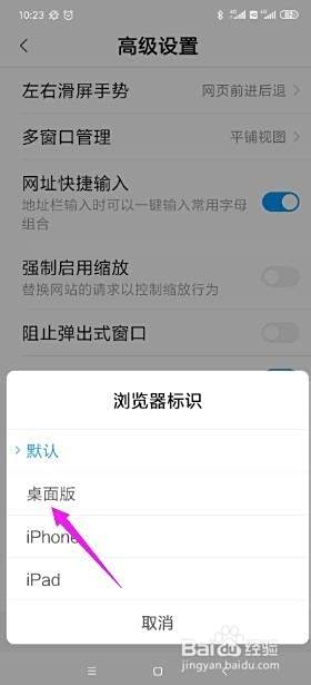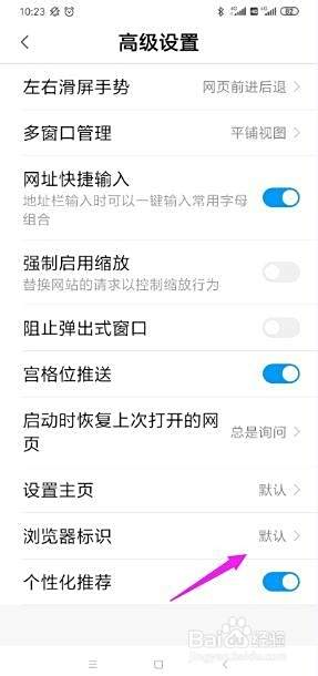 在高级设置的主界面,找到浏览器标识的选项,点击打开。