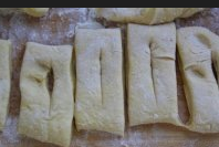 把面团做成小果子的坯子,长方形的中间切一刀。