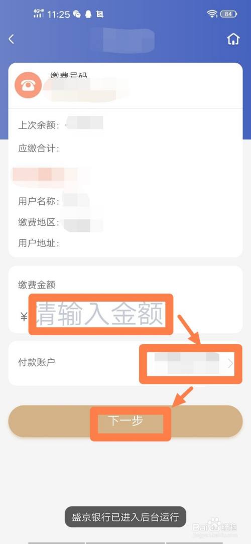 输入“缴费金额”,选择“付款账户”后,单击“下一步”