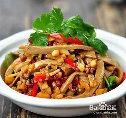 趁热将花椒油倒入盆内,将花椒粒滤出;将其搅拌均匀;捞出码盘即可。