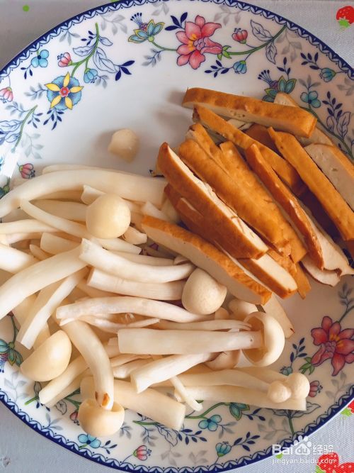 豆干切条状,海鲜菇对切,清洗