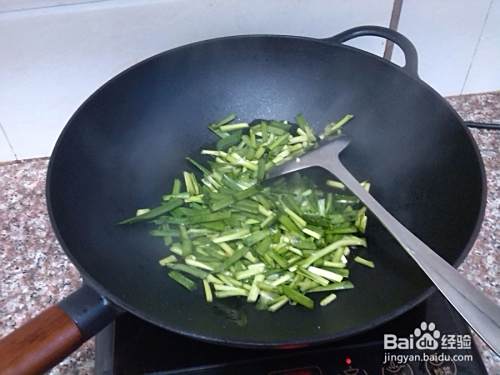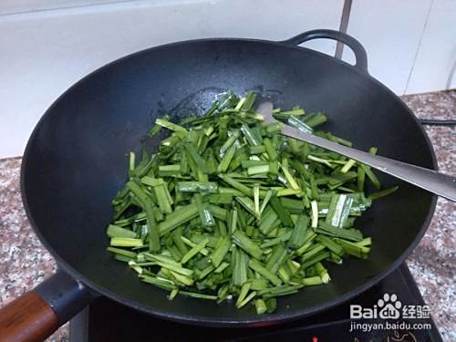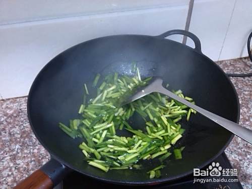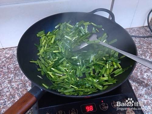 由于韭菜根部更不容易熟,炒的时候,根部要先下锅炒一会,再放叶子下去一起炒。