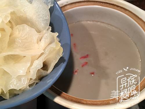 87、黑豆浆转到煤气灶上,放入枸杞子与撕成小裕国排块的鲜银耳。煮开,加糖。