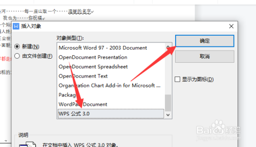 wps软件中打开文档后,打开插入菜单栏,然后点击打开对象窗口,选择WPS 公式3.0,点击确定后就可以调出公式编辑器了。