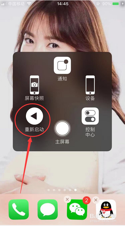 设置好之后,回到手机桌面,点开辅助触控小白点就可以看到有个 重新启动 的快捷键了,只要点击它手机就会重新启动,如下图