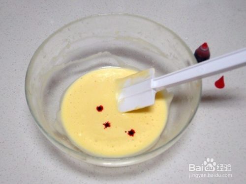 开始加入食用色素(*开始预热烤箱,上下火170度)。先来红色的蛋糕坯,先往蛋糕糊里挤几滴红色素。