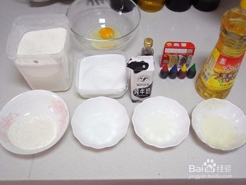 第一部分:先来制作七色蛋糕坯。 准备好相应的食材:鸡蛋1只,低粉35g,糖粉30g,牛奶15g,玉米油10g,香草精几滴,食用色素适量。