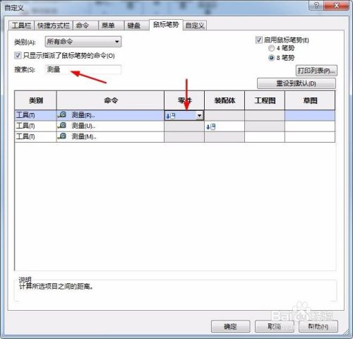 在搜索命令框中输入想要设置的命令(比如:测量),下方就对弹出有关测量的命令,(其中灰色部分是不能选择的)选中白色的部分,点选下拉框,就可以设定对应的笔势了,如下图所示