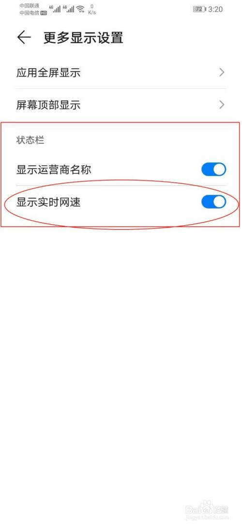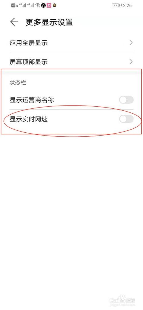 点开“更多显示设置”,在新界面的“状态栏”中找到“显示实时网速”,如图