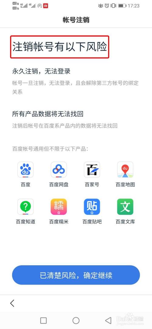 第05步,系统给出风险提示,如果执意注销帐号,可选择“已清楚风险,确定继续”,即可完成帐号注销。