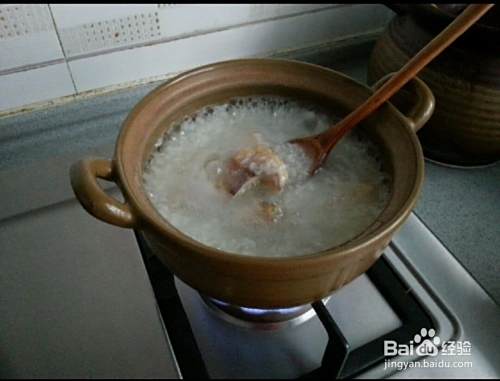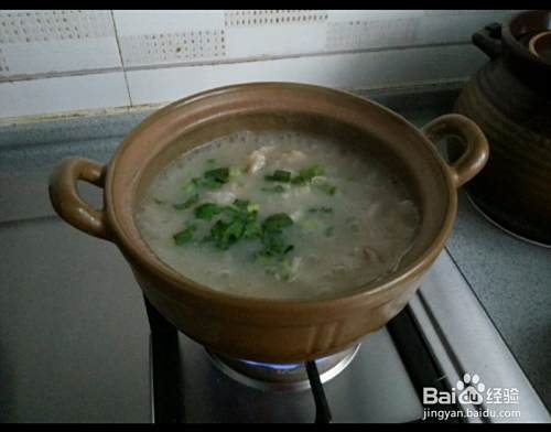 3、用砂锅发火煮来白粥,待白粥煮好,放入鱼片和姜丝。