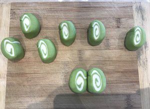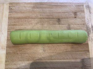 把不平整的一面相对着叠起来。从面片多出来的一端开始,慢慢卷起来。再来回轻轻用手压着滚几下,让它们更好粘合,并且卷出来的面团从左到右粗细一致。