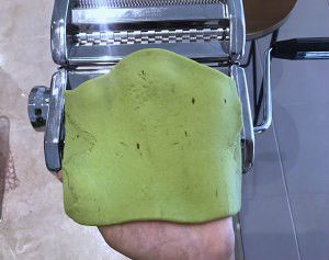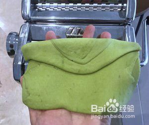 压面机最厚的一档,来回压5-6次,直到面片光洁,成边缘整齐的长方形。