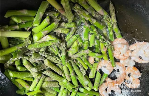 1.芦笋洗净斜切段。炒锅放油,待油热,放入虾仁煎到一面变红。