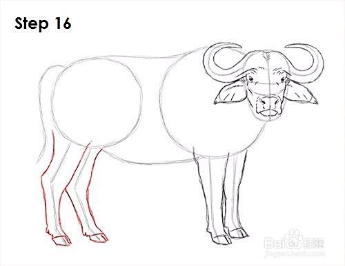 第16步:用左侧的两条线作为导游,画出非洲海角水牛的后腿。轻轻勾画第一条腿的形状时,请遵循指南的基本路径。只有当你拥有正确的腿部结构时,才能使线条变暗。腿部应在关节处弯曲两次。使用几条小线在底部添加蹄。以相同的方式在另一侧绘制后腿。腿部应该在顶部较厚,并逐渐向底部变瘦。