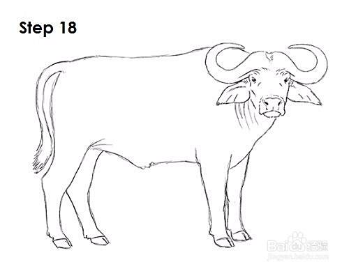第17步:使用剩余的形状和线条作为指南,以绘制非洲角斗牛的身体和尾巴的其余部分。当您变暗线条时,按照指南的路径行走。在颈部附近添加一些线代表皮肤的褶皱。使用左侧的线作为引导画出尾巴。使用短而快的笔画使笔尖变得浓密。